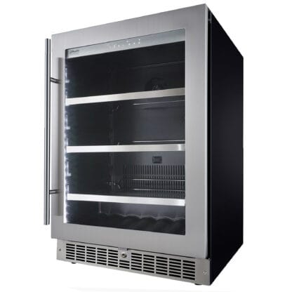 Fit for the most discerning beer buff, soda lover or juice enthusiast, this center is equipped to carry a heavy load of beverages. The well-spaced shelves thoughtfully leave room for wine storage at the base of the unit and the tempered glass door keeps your bounty of brews in prime view.