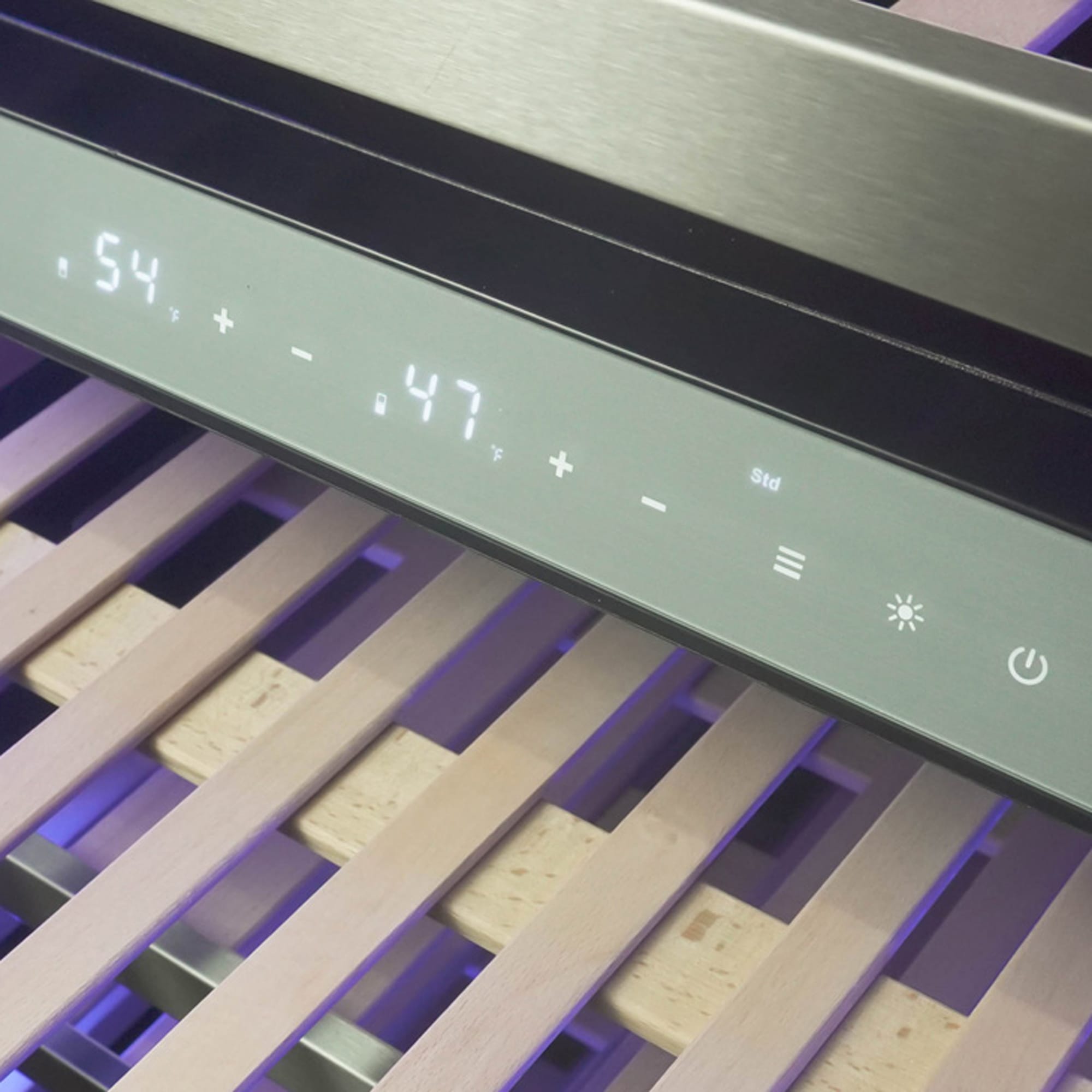 Introducing our premium built-in wine column, designed to store and showcase your collection of up to 129 bottles. This unit features two temperature zones with a range of 41°F to 64°F (5°C to 18°C) for optimal storage conditions. Equipped with Pro-vection cooling technology, this wine column has two whisper-quiet fans for even temperature distribution.