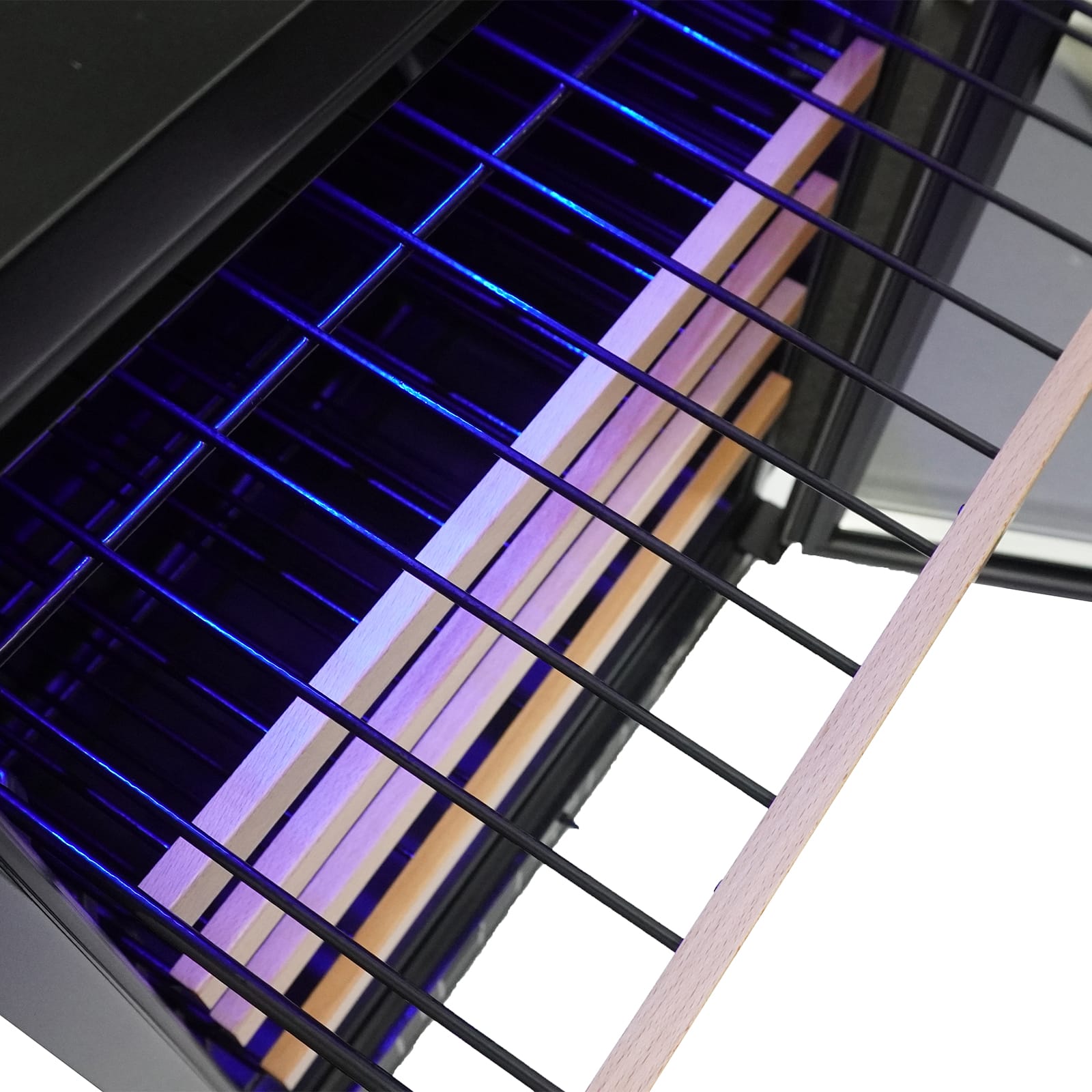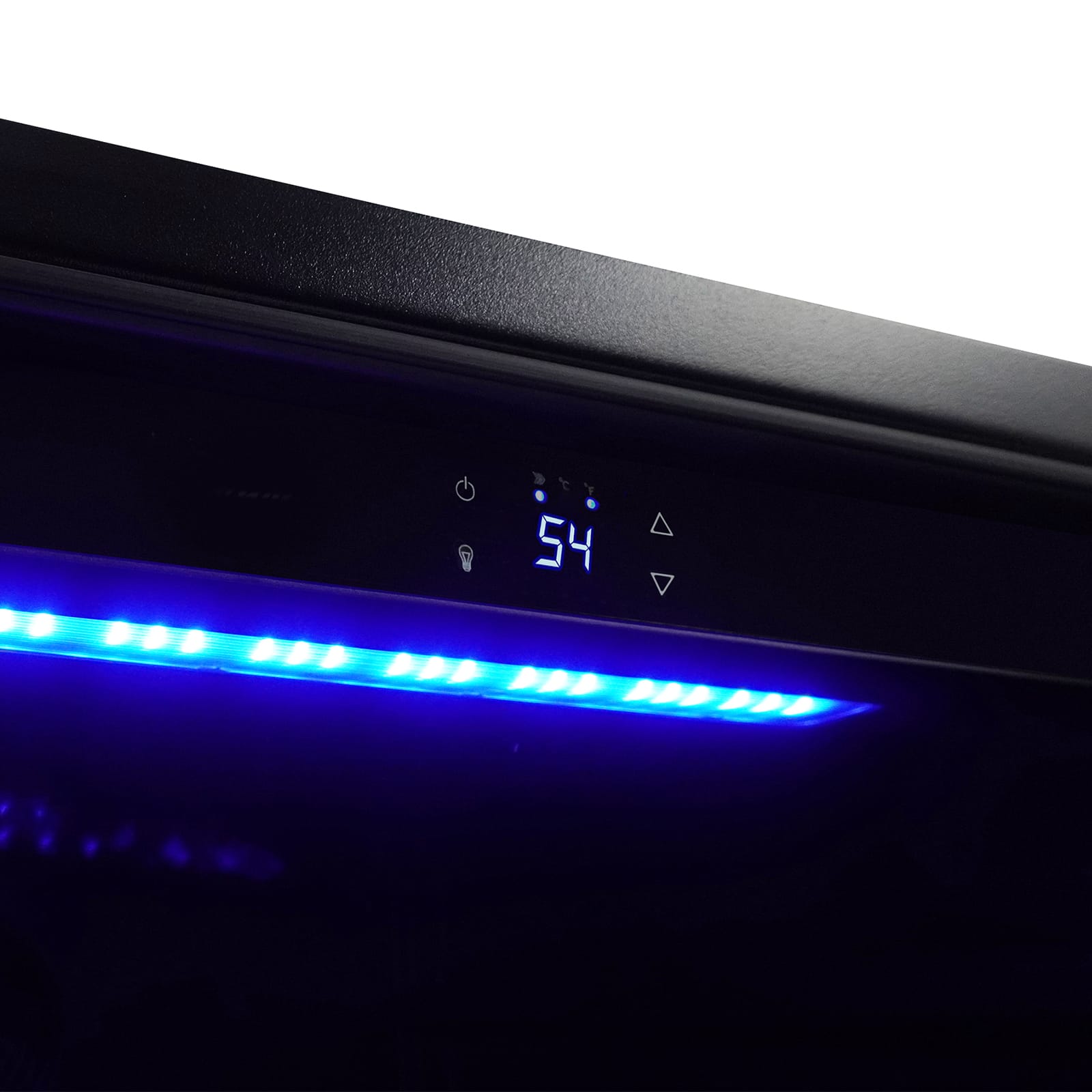 Our wine cellar features strategically placed internal sensors that monitor and react to maintain a stable internal temperature, minimizing stratification. It includes temperature recall, a door ajar alarm, and a temperature alarm. The blue LED interior display light offers two intensity options for optimal visibility. With extendable shelves featuring wood trim, modern capacitive touch controls, and a 2-year parts and labor warranty, this wine cellar combines functionality and style seamlessly.