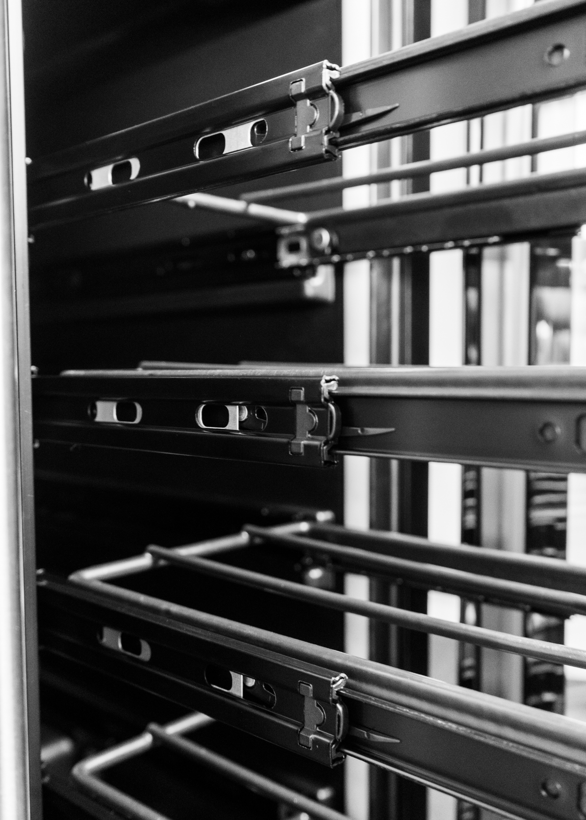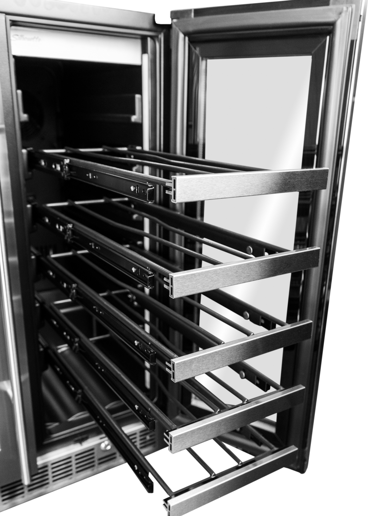 - Pro-glide: anti-vibration, full extension shelving for wine, 3 adjustable clear glass shelves for beverage